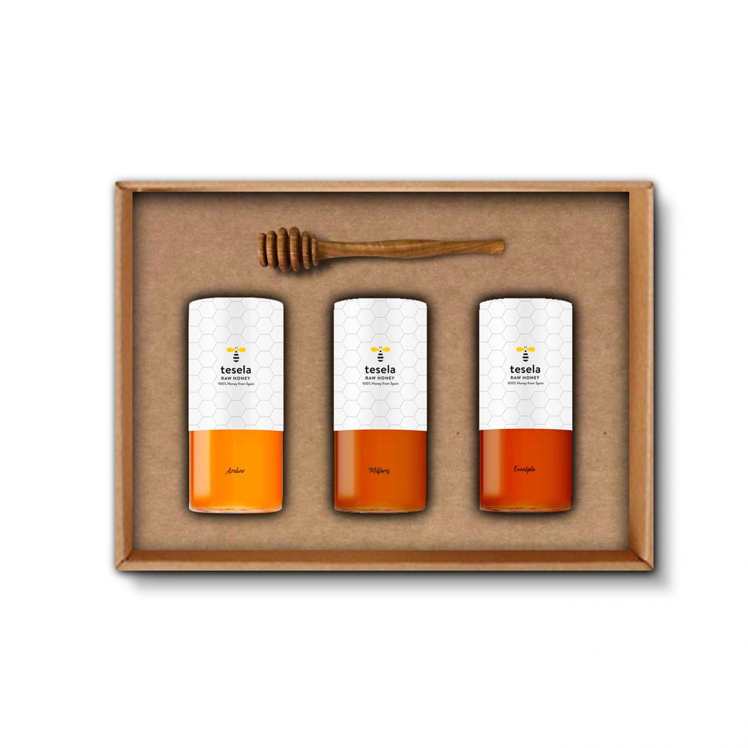 El estuche premium está realizado en papel craft y contiene 3 tarros de miel premium de 320 gramos (azahar, milflores y eucalipto), con nuestro exclusivo diseño sombrerera con golpe seco. Además, el conjunto se contempla con un palito de madera de olivo.